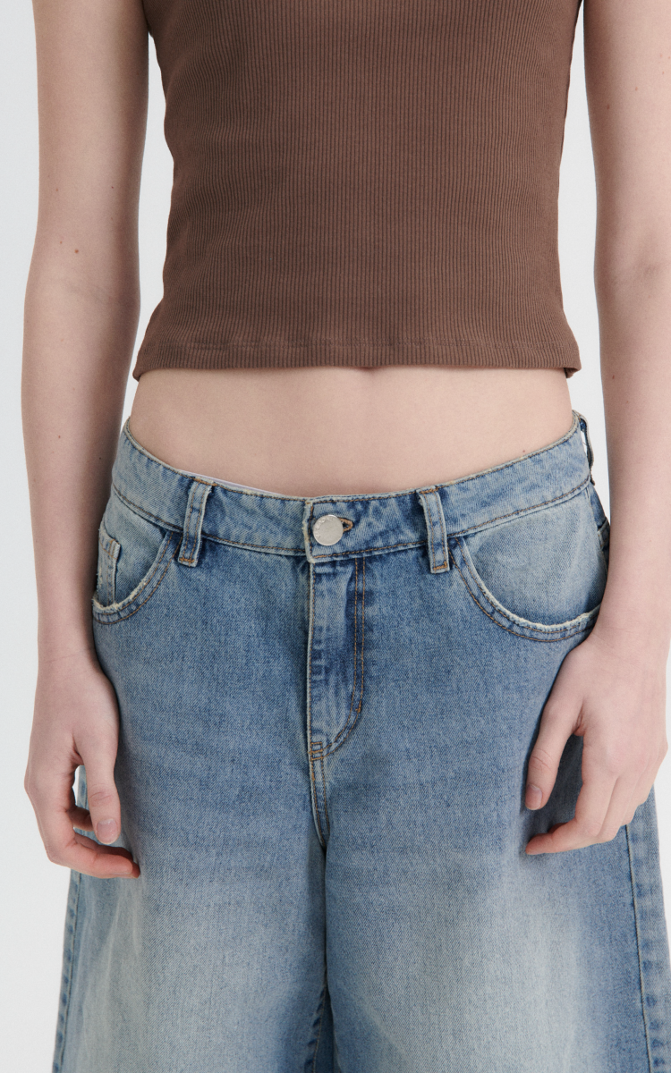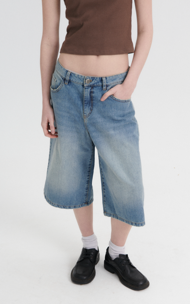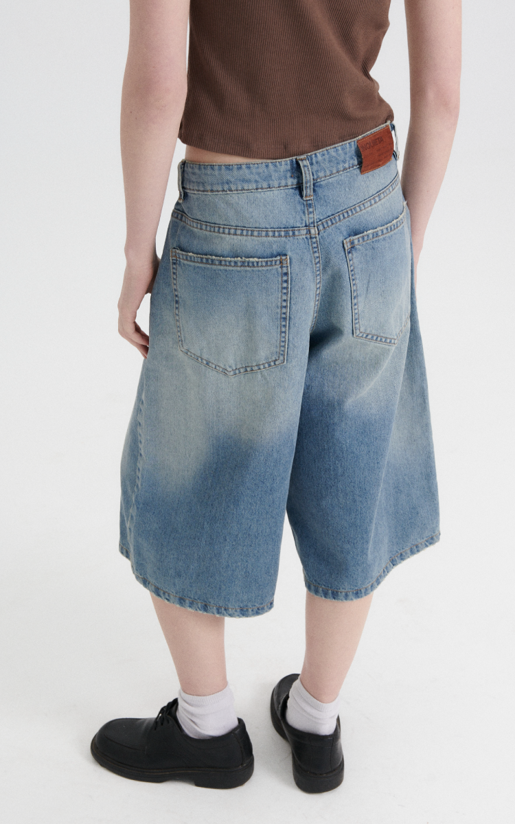 Bermuda larga estilo «jort». Baggy fit. Tiro bajo. Denim rígido. 5 bolsillos.
