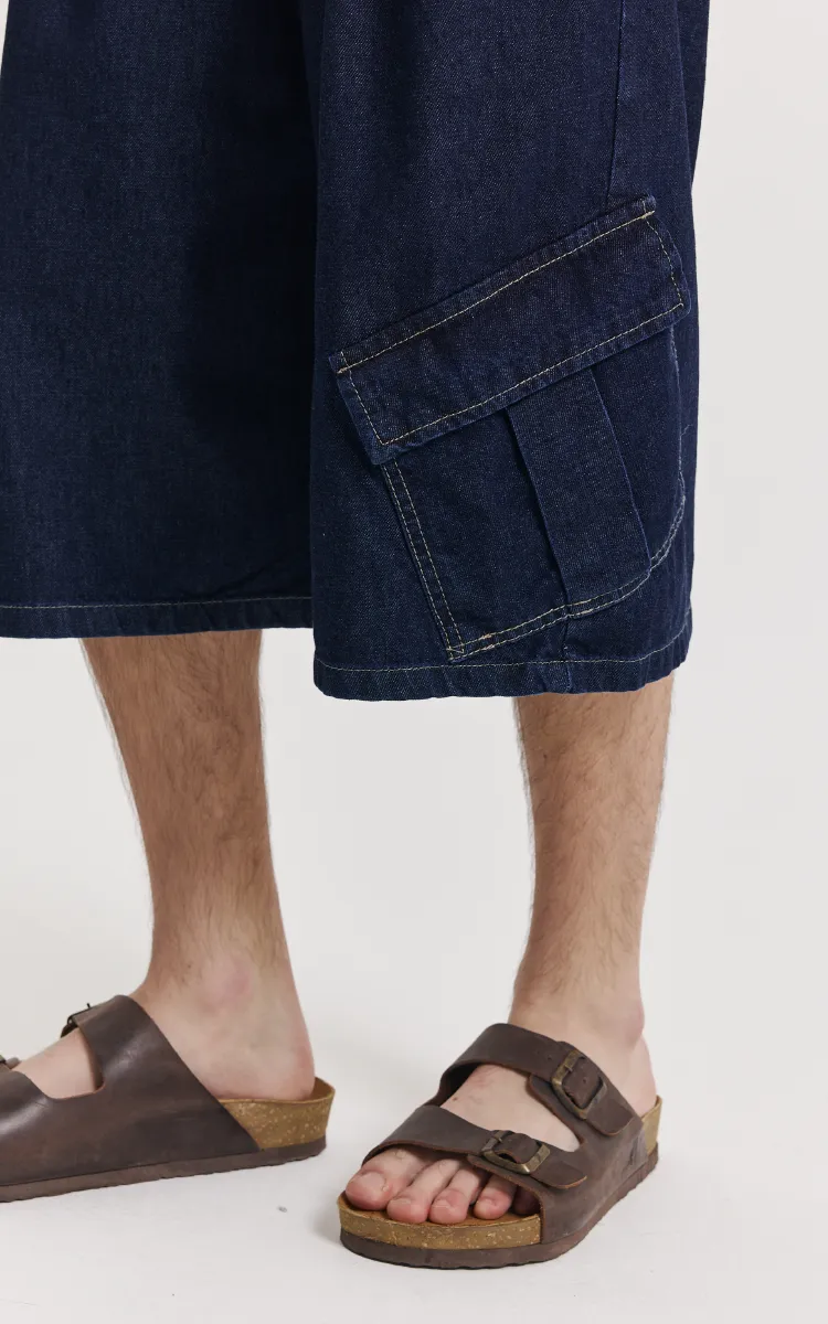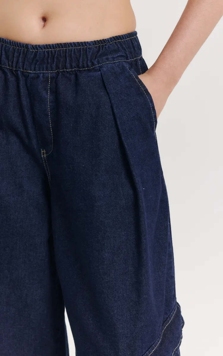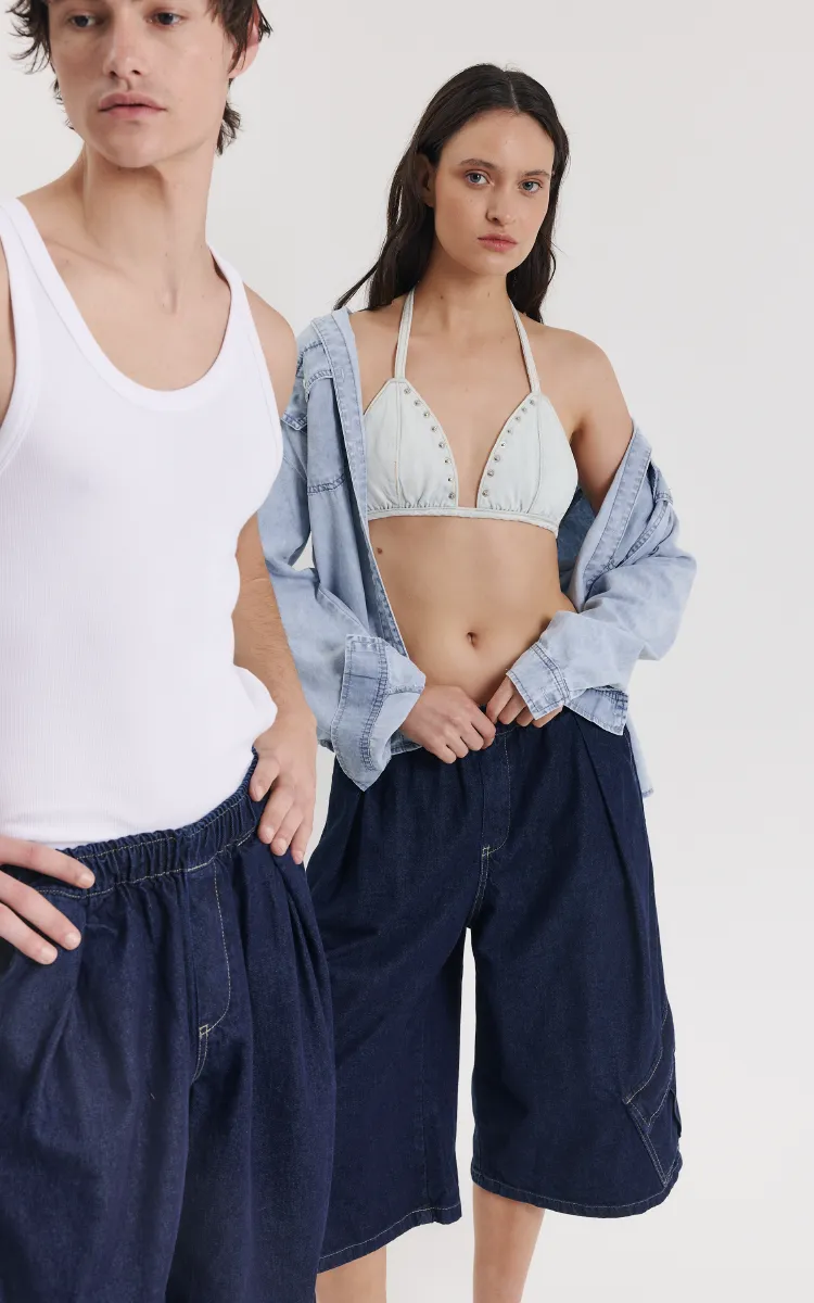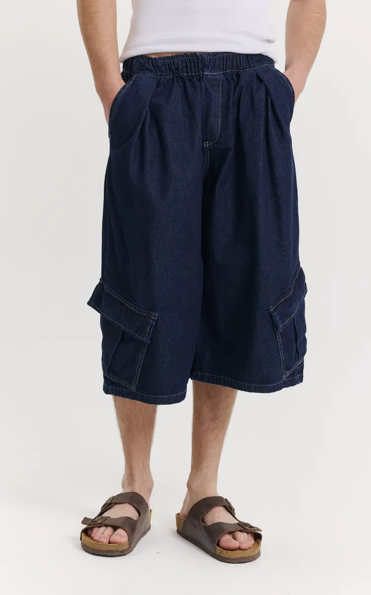 Bermuda jort inspirada en los 90 con silueta raw denim. Diseñado en denim rígido.Con cintura elástica de tiro medio y bolsillos cargos extragrandes.