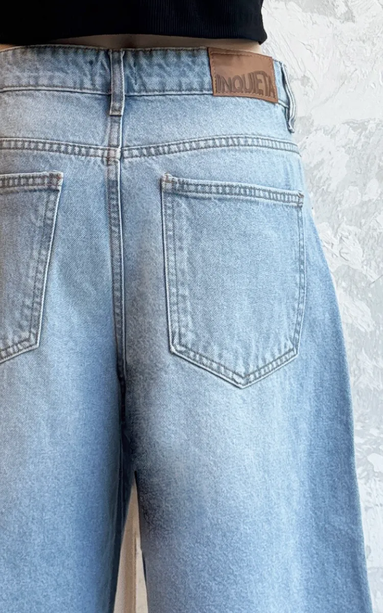 Bermuda larga estilo «jort» en color celeste. Baggy fit. Tiro bajo. Denim rígido. 5 bolsillos.