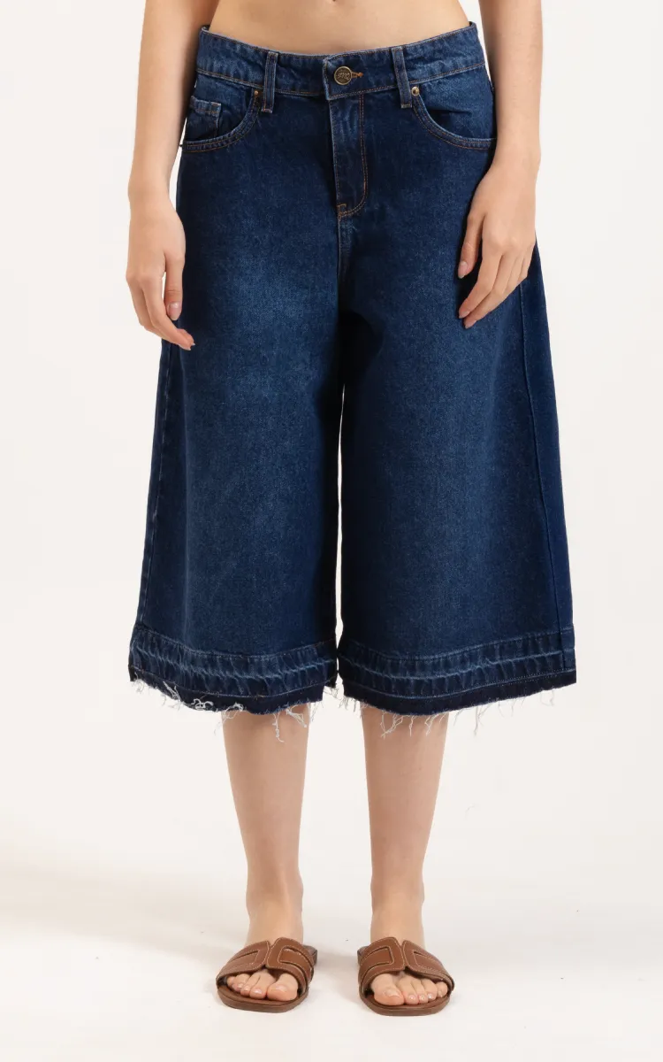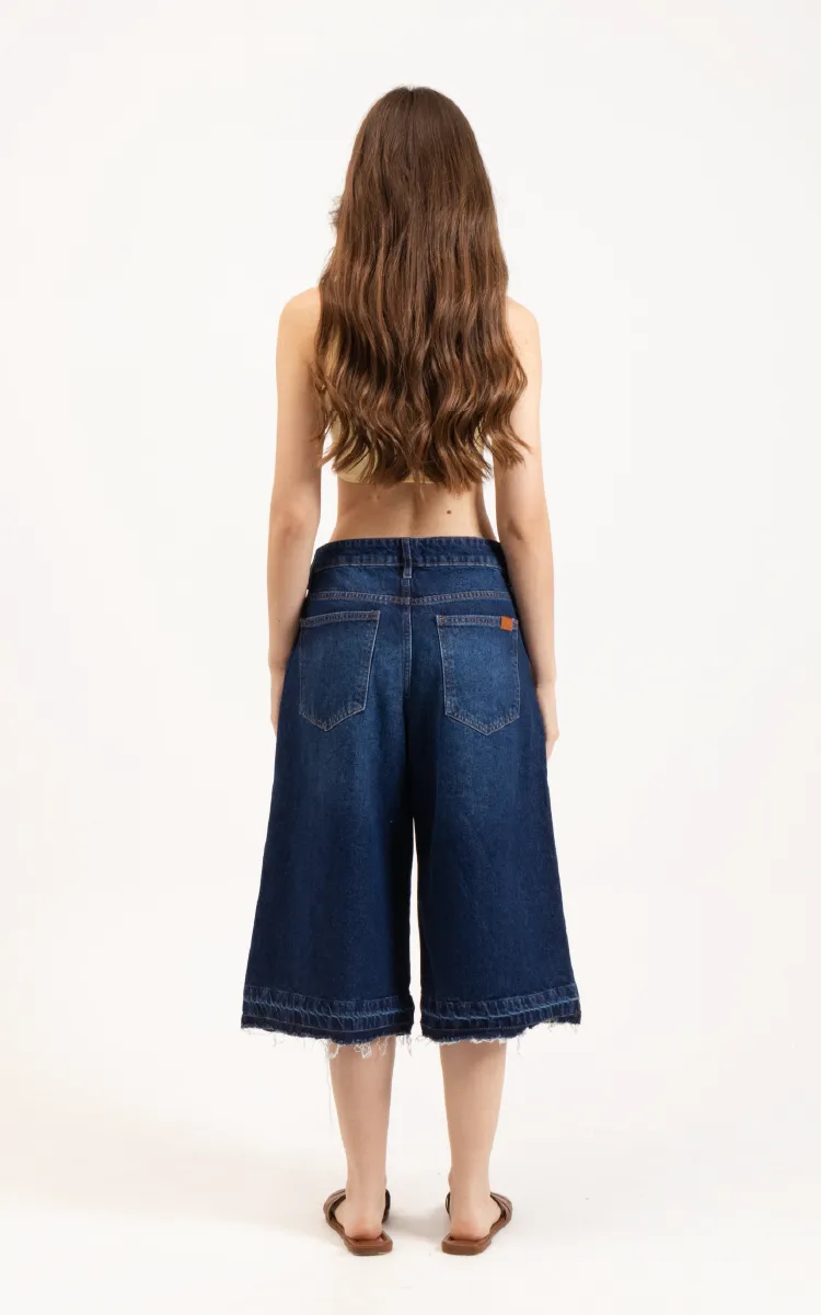 Bermuda larga estilo «jort» con ruedo desflecado. Baggy fit. Tiro bajo. Denim rígido. 5 bolsillos.