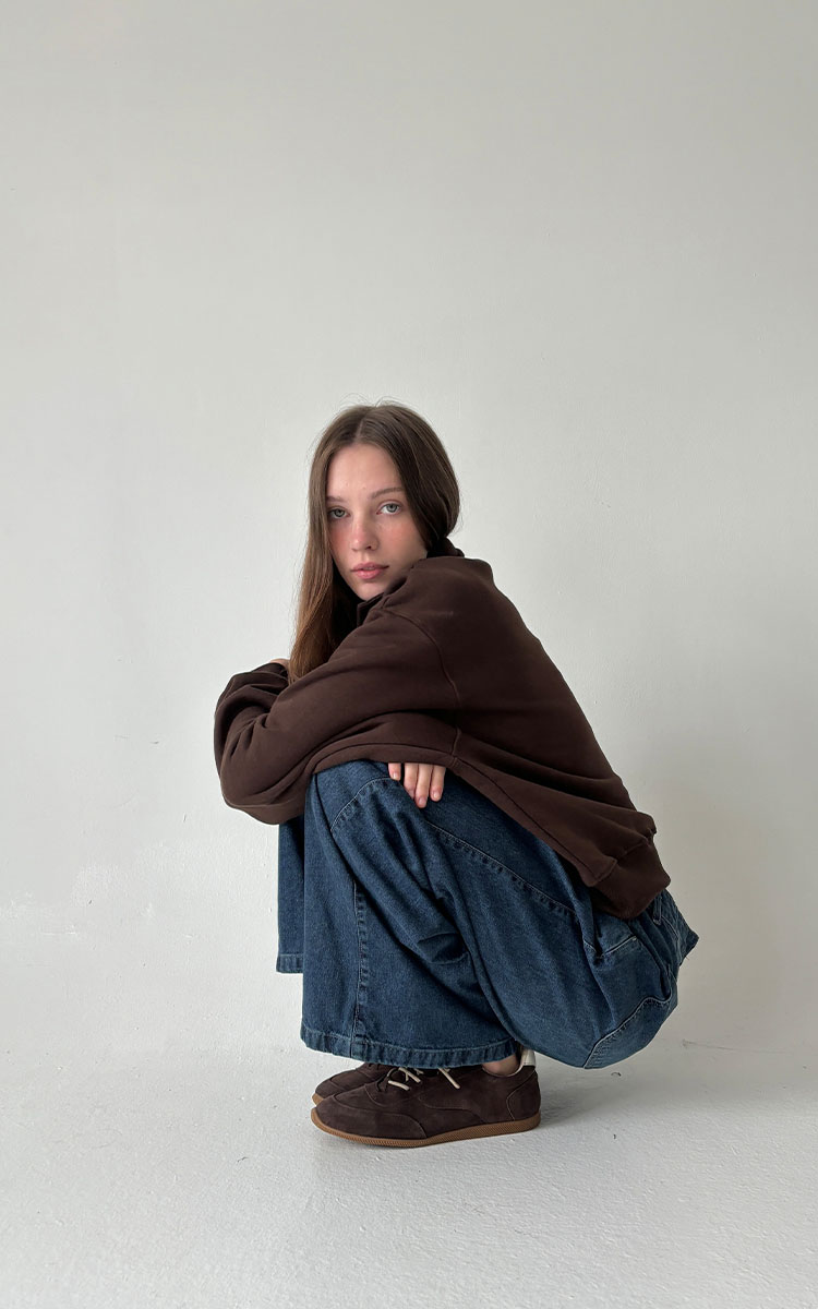 Buzo de calce oversize confeccionado en algodón frisado, suave y abrigado en su interior. Diseño con cuello tipo polo y cierre metálico. Hombros caídos y mangas amplias para mayor comodidad.