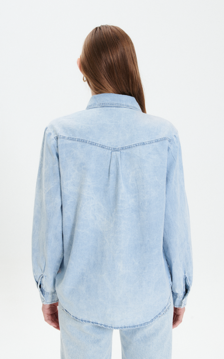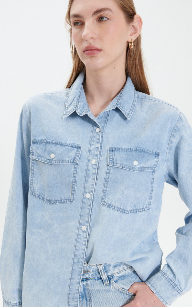 Camisa regular fit denim rígido liviano. 2 bolsillos delanteros con tapas. Lavado nevado.