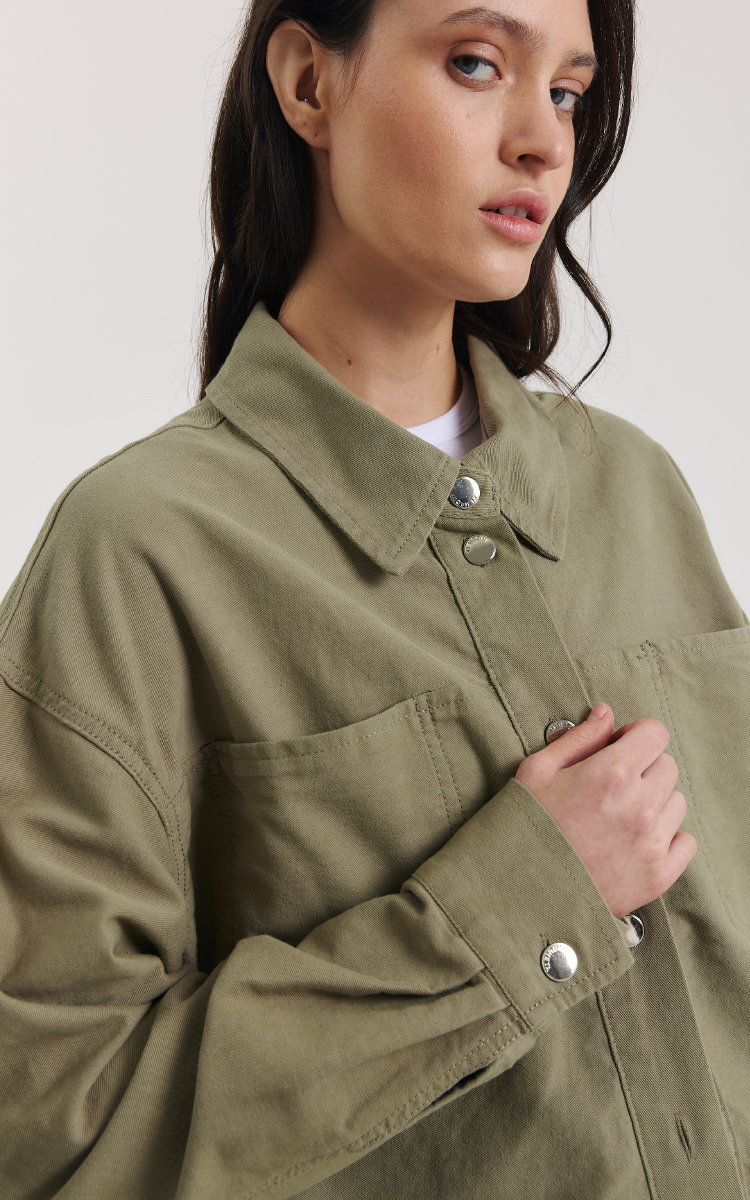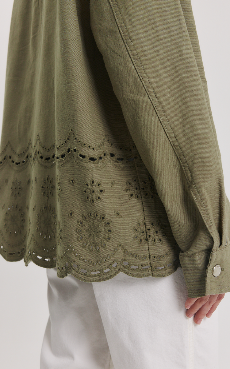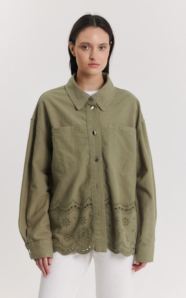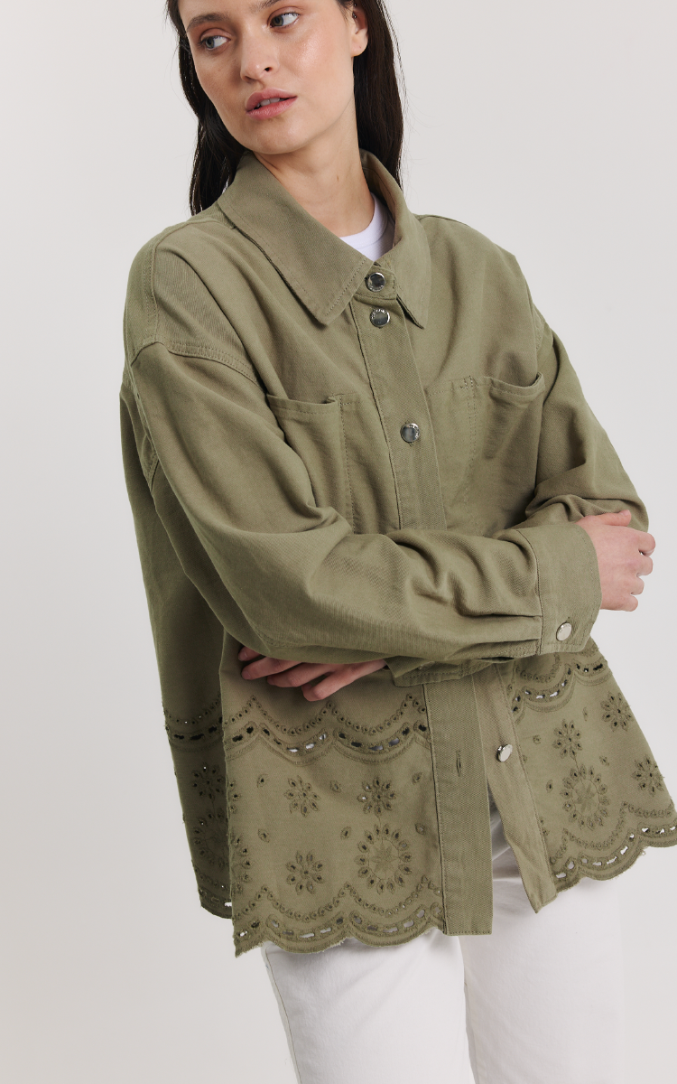 Campera oversize de gabardina con un acabado broderie en la parte inferior. Dipsonible en color crema, beige y verde militar. Talle unico. Prenda importada, de diseño exclusivo y calidad premium.