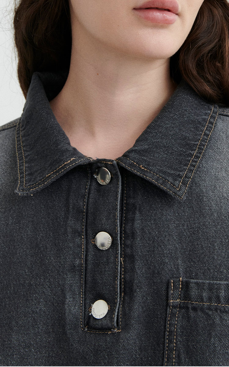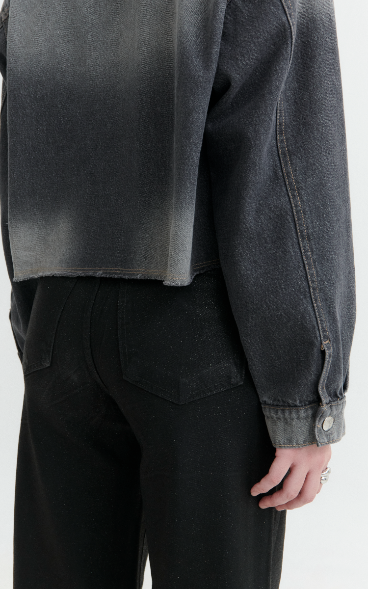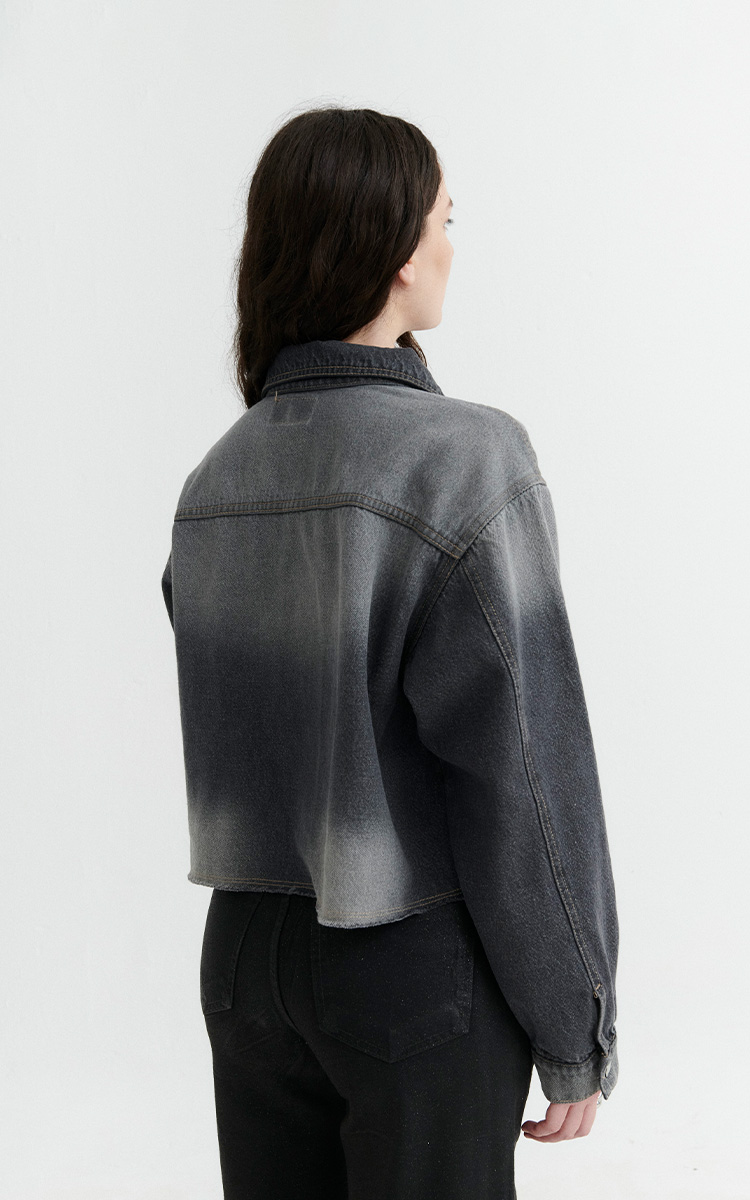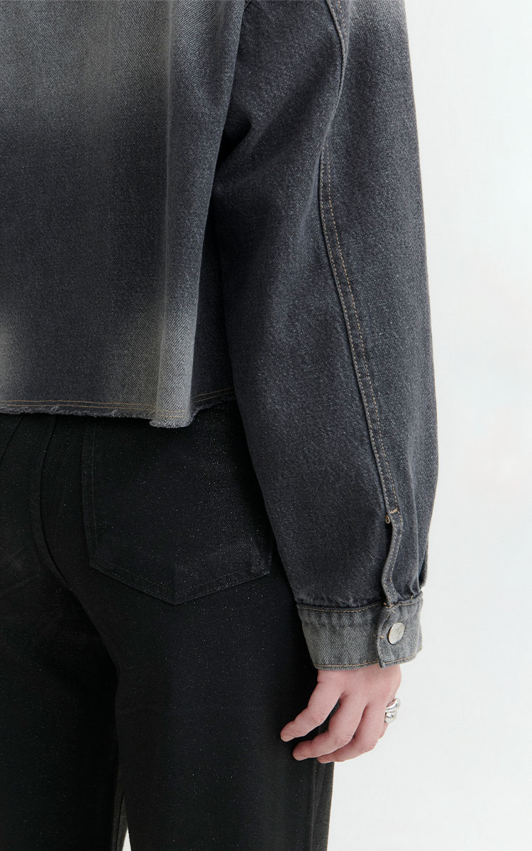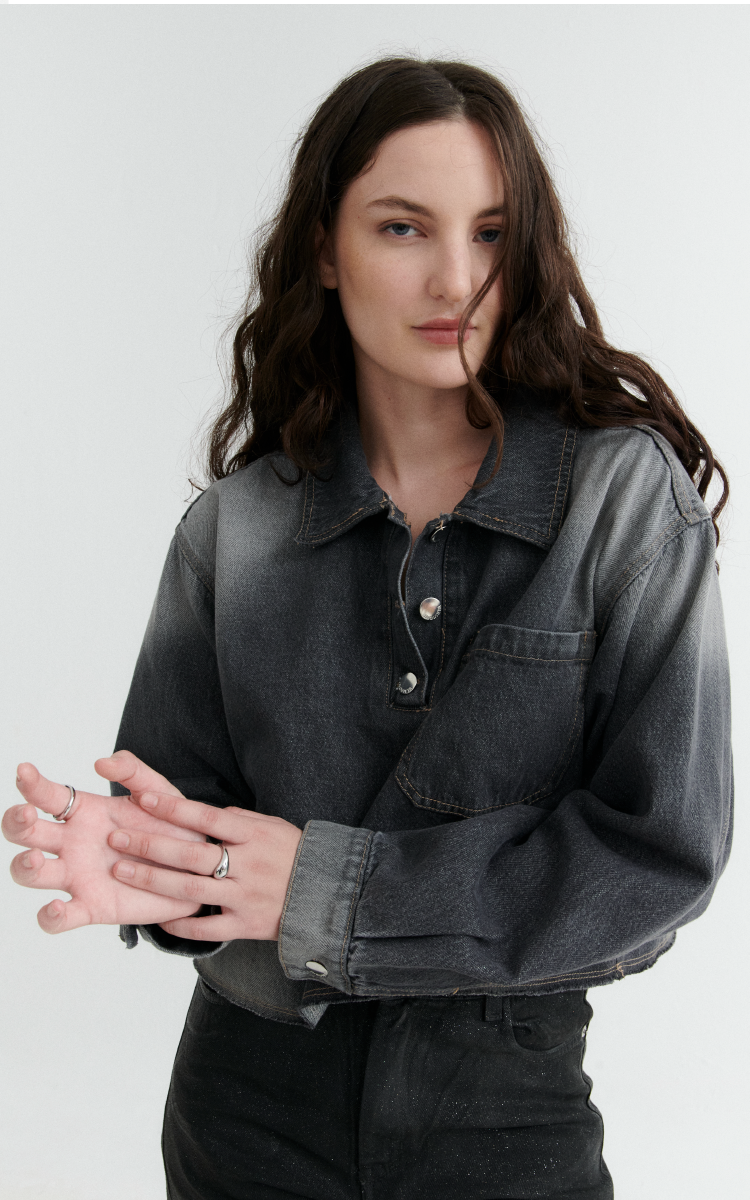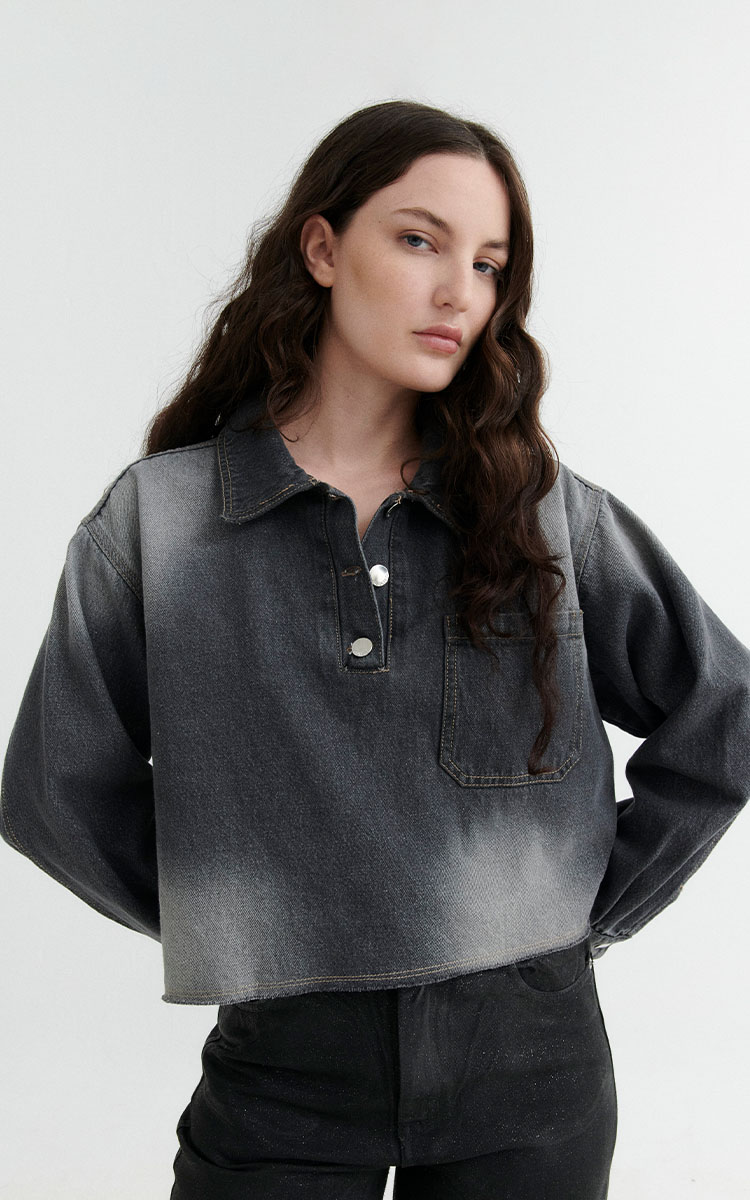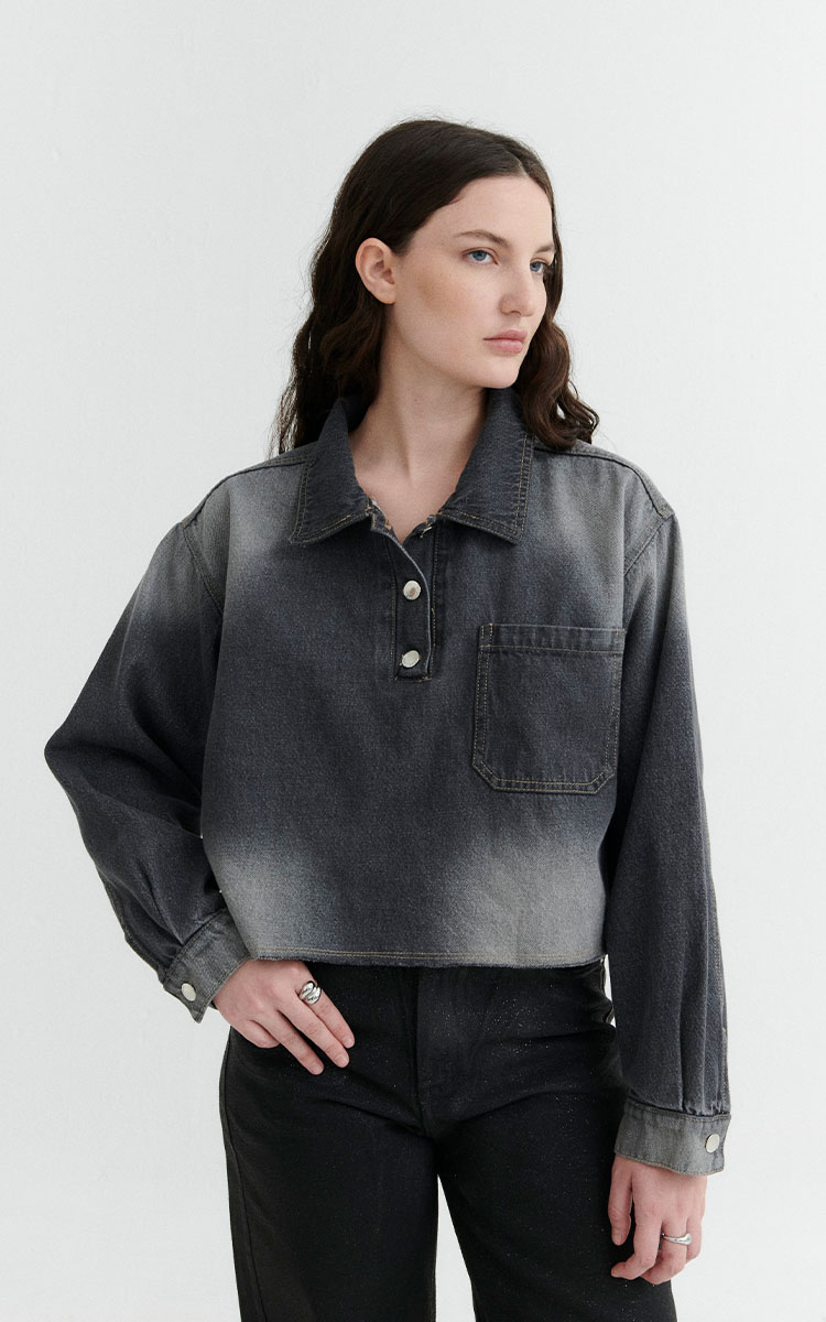 Chomba cropped de denim rigido en tono gris desgastado. Diseño con bolsillo frontal, puños abotonados y terminaciones desflecadas. Cuello con botones metálicos.