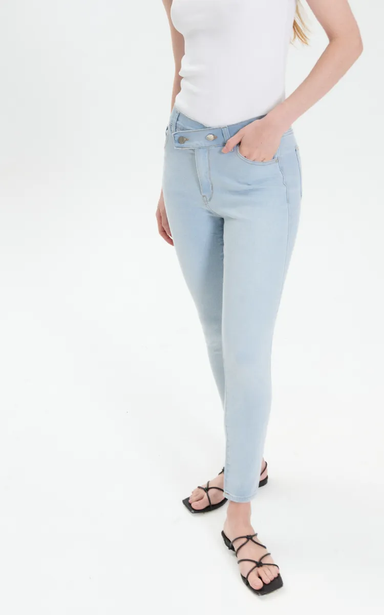 Jean chupín elastizado. Tiro medio. Cintura cruzada con 2 botones. 5 bolsillos.