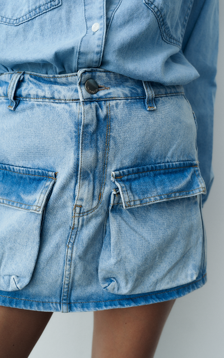 Mini falda denim rígido tiro alto. Bolsillos frontales con fuelle y tapa.