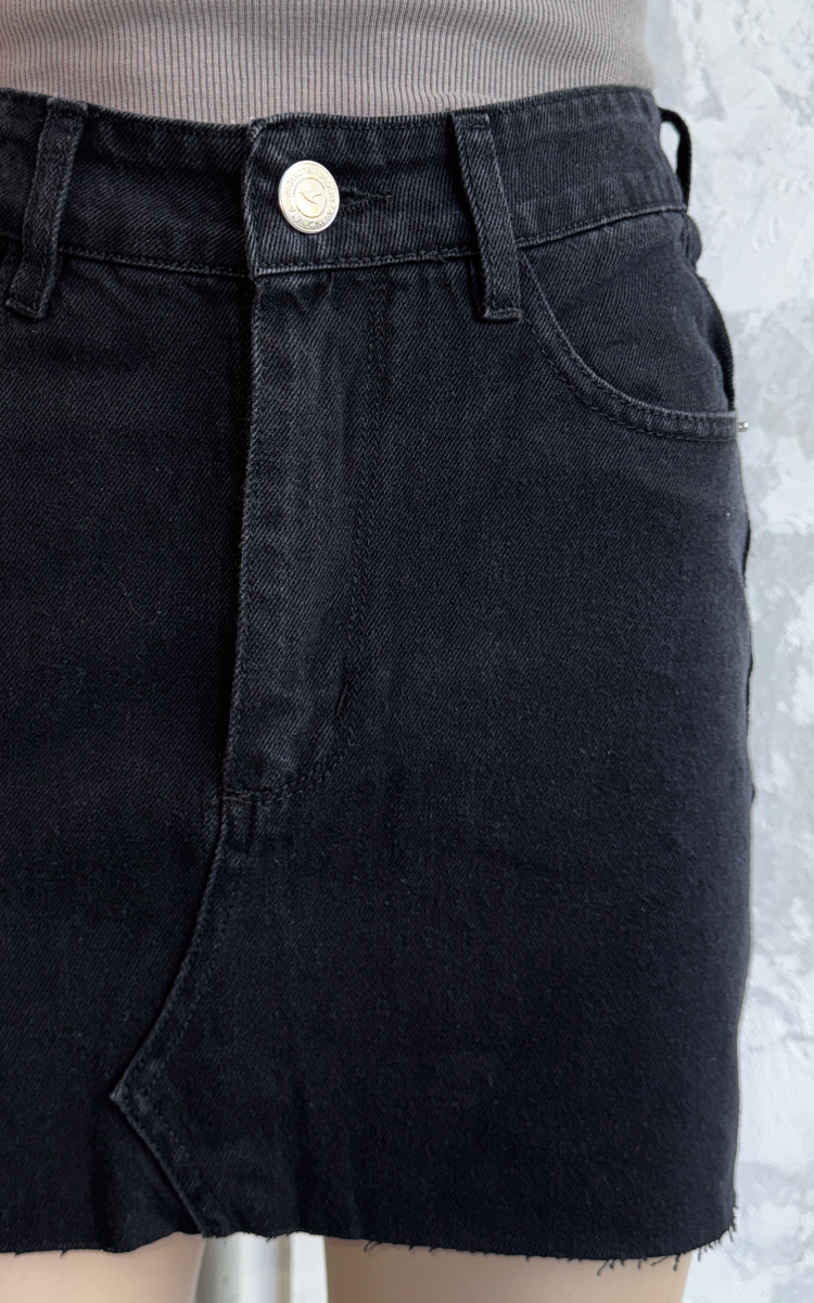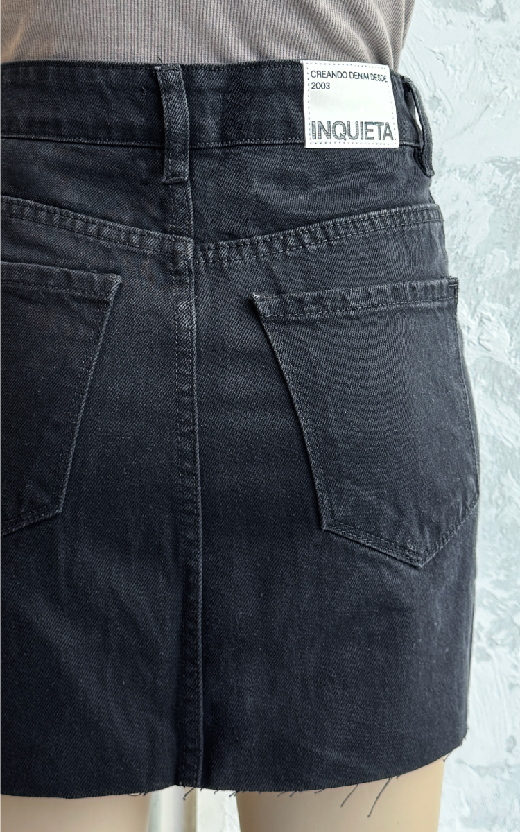 Minifalda de denim rígido. Diseño 5 bolsillos con ruedo desflecado.