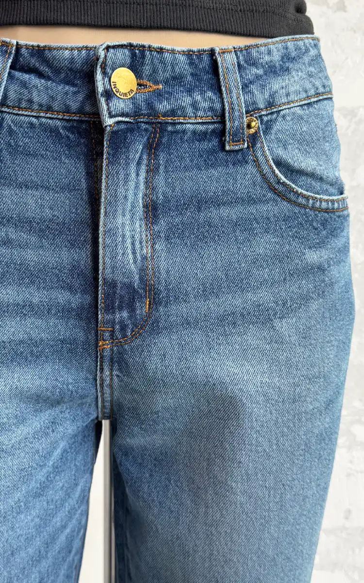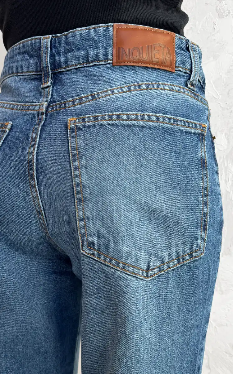 Jean mom de tiro alto en denim rigido, 100% algodón. Diseño de 5 bolsillos.