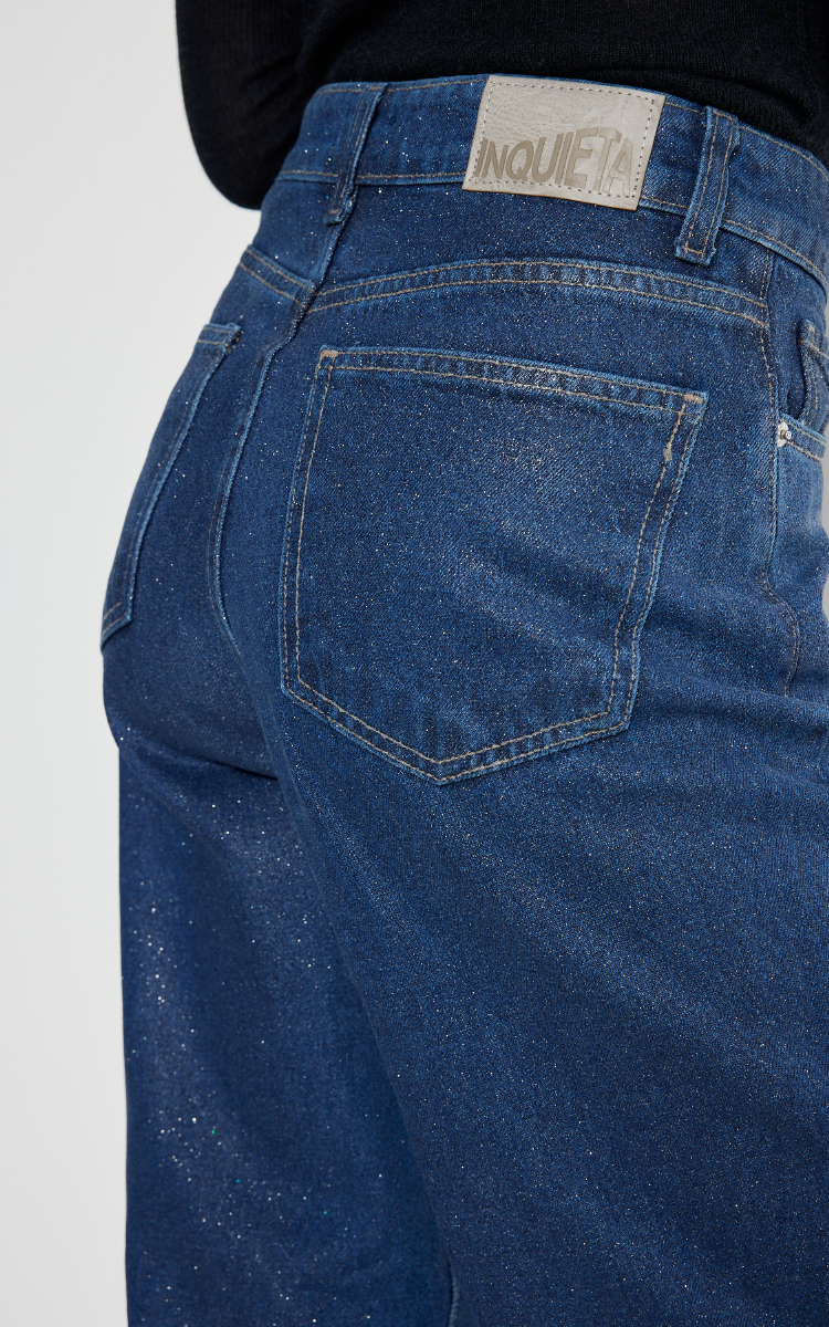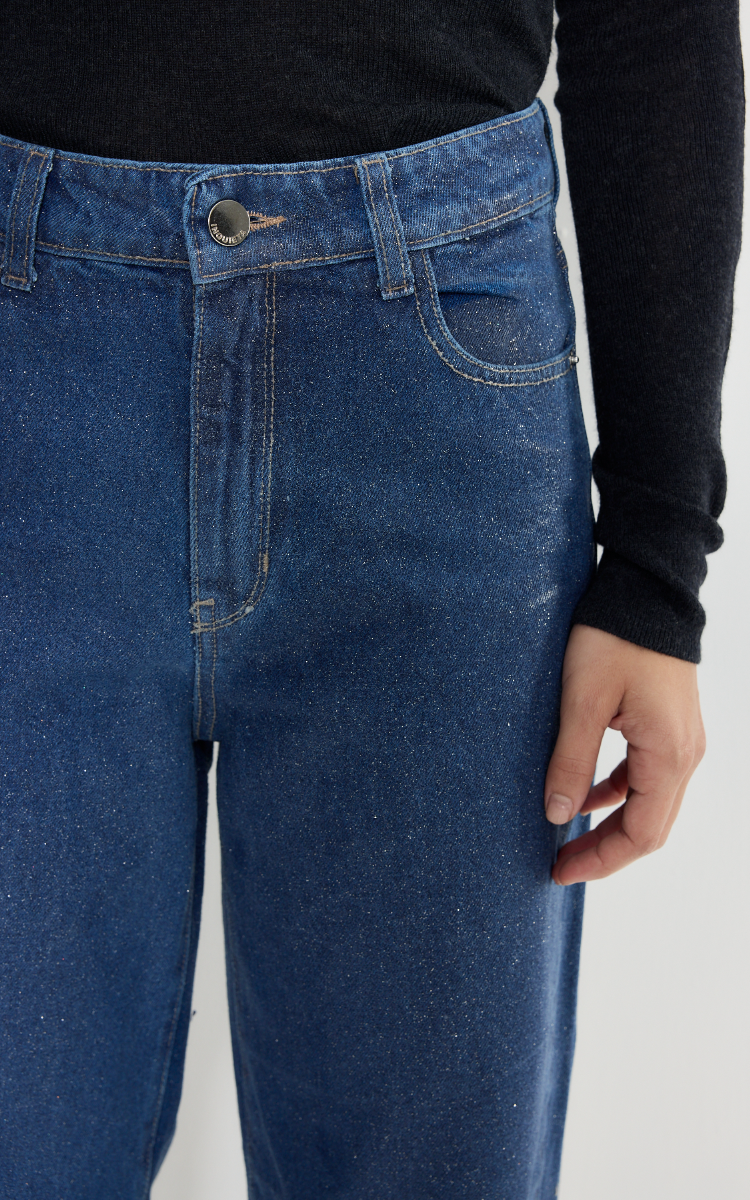 Jean recto de tiro alto en denim 100% algodón con efecto glitter engomado. Diseño de 5 bolsillos.