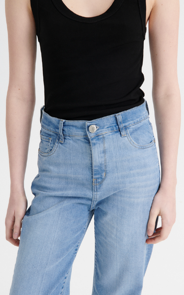 Jean recto de tiro alto con un toque de spandex para mayor comodidad, diseño clásico de 5 bolsillos.