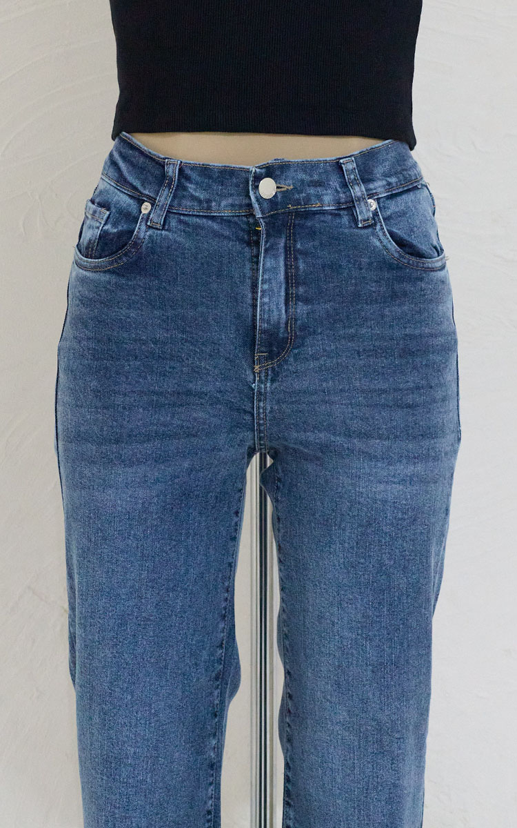 Jean recto de tiro alto con un toque de spandex para mayor comodidad, diseño clásico de 5 bolsillos.