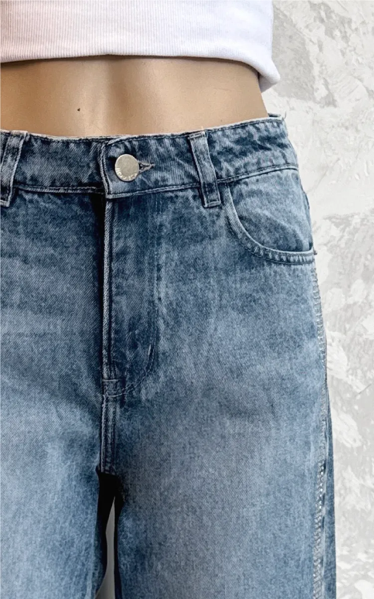 Jean recto de tiro alto en denim 100% algodón con lavado celeste desgastado y aplicación de brillos hotfix en el lateral. Degradé en botamanga. 5 bolsillos.
