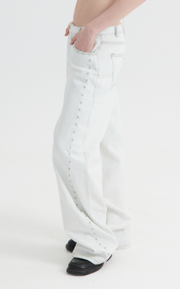 Jeans recto de tiro bajo en denim 100% algodón. Detalle de tachas a lo largo del recortes laterales. Detalle de 5 bolsillos con cierre frontal de botón metálico y cierre.