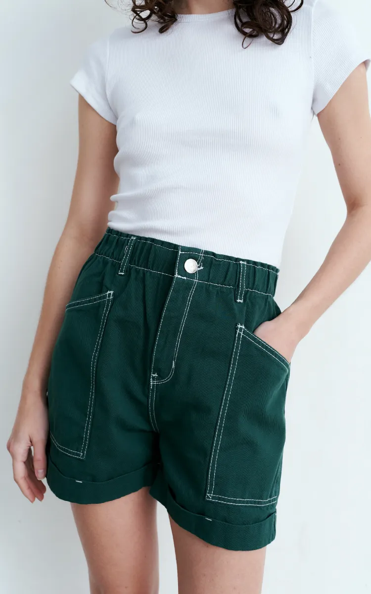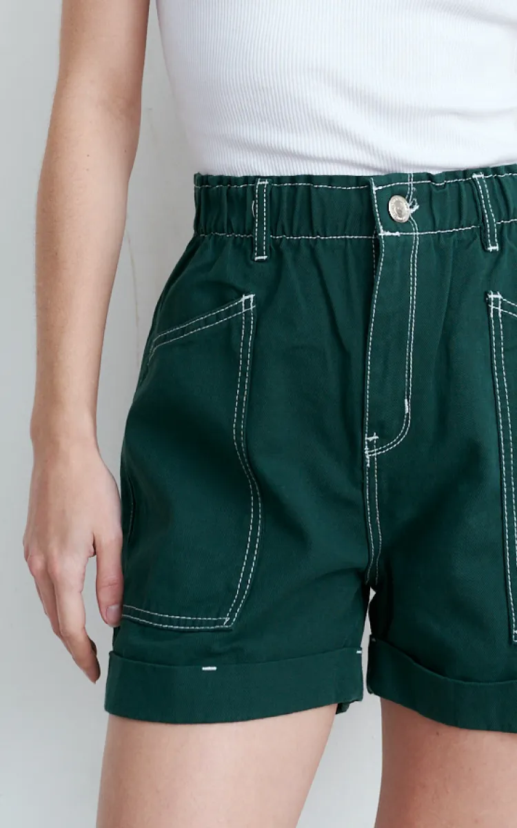 Short baggy-fit tiro alto de gabardina rígida con elástico en la cintura. Bolsillos plaqué en delantero y espalda.