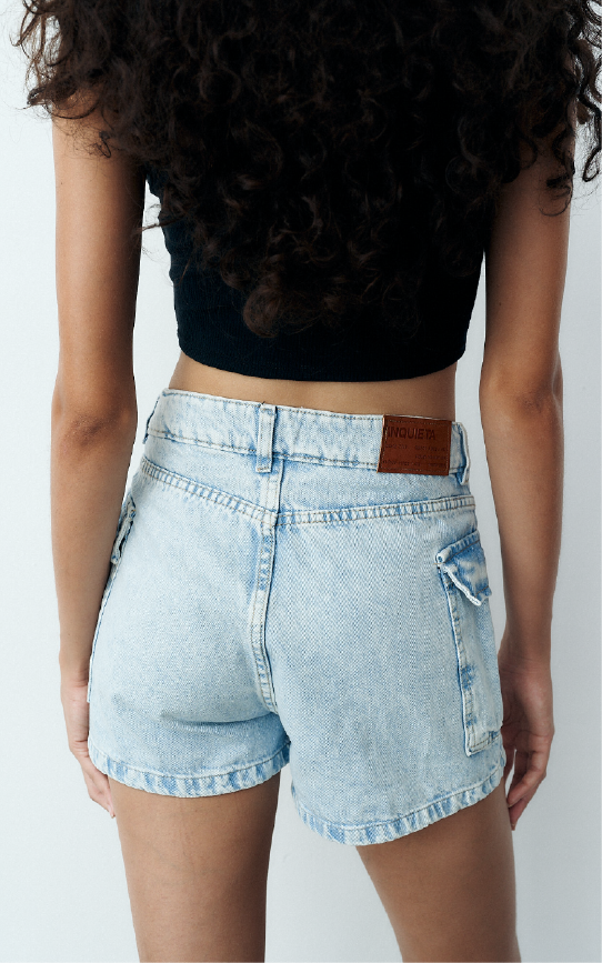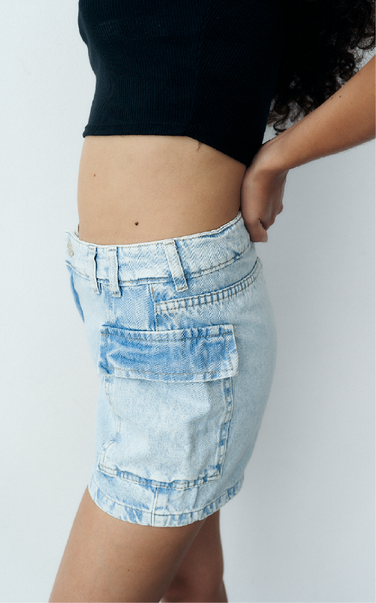 Short denim rígido. Tiro alto. Bolsillos cargo laterales.