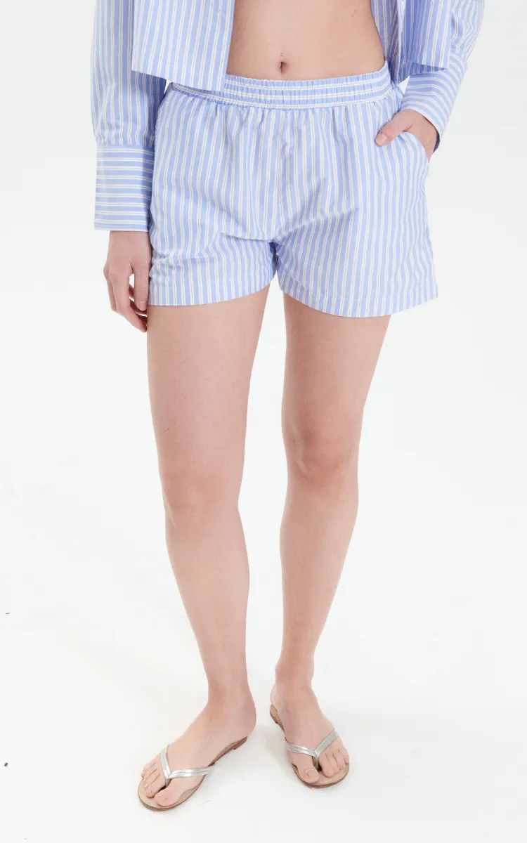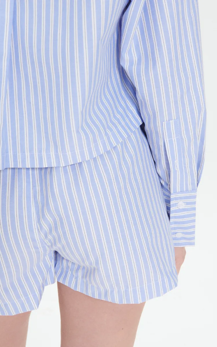 Short estilo boxer en poplin rayado celeste 100% algodón. Elástico en cintura. Bolsillos laterales.