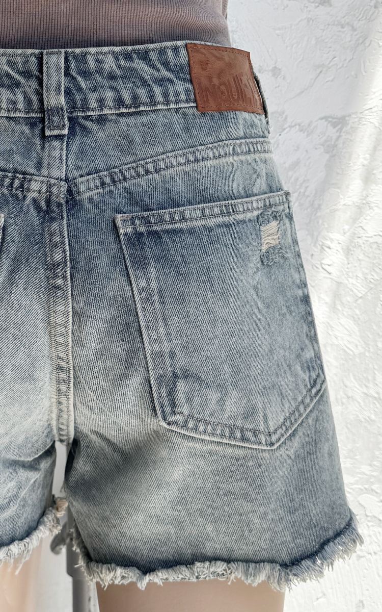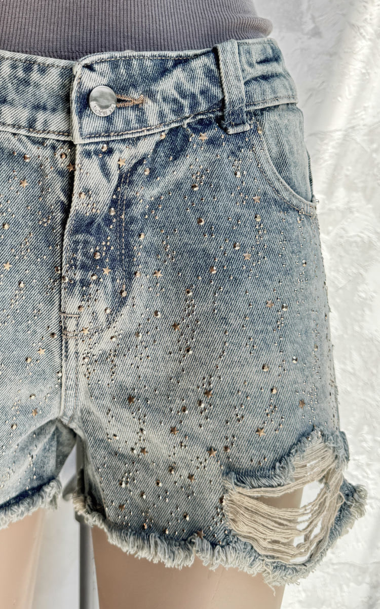 Short denim rígido con roturas y strass dorado con estrellas en el frente. Tiro alto. Matizado.