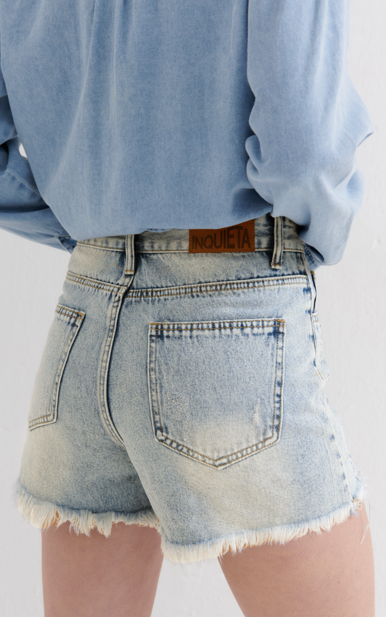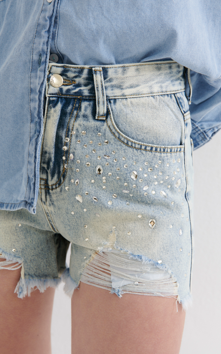 Short de denim tiro medio 100% algodón, con apliques de brillos grandes y ruedo deflecado. Diseño de 5 bolsillos. Stock Limitado.