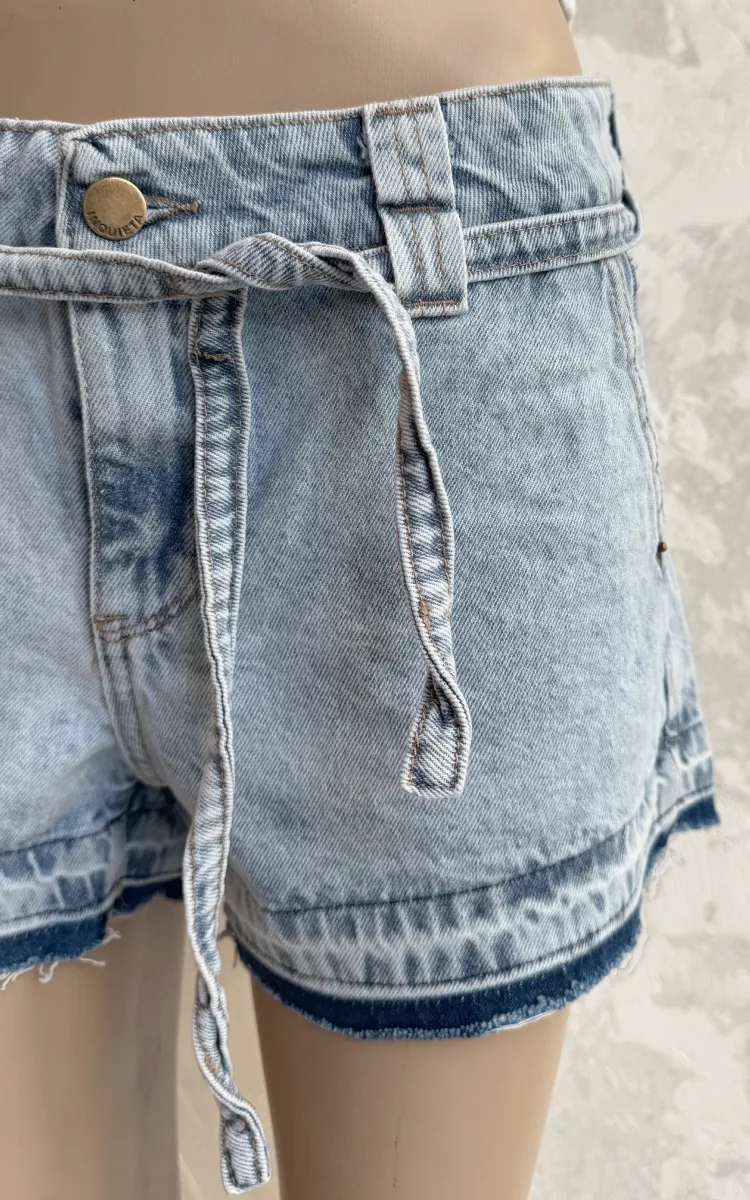 Short tiro bajo en denim rígido con ruedo desflecado. Con bolsillos delanteros tipo chino y lazo para atar en la cintura.