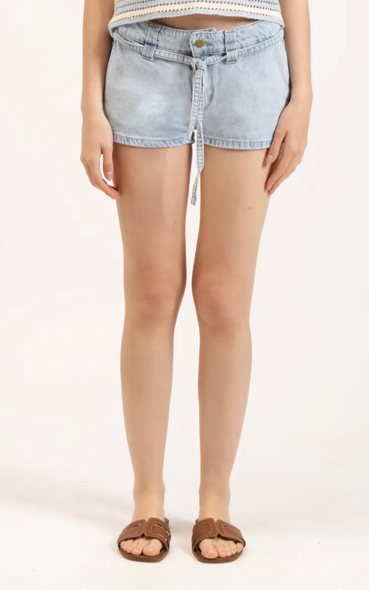 Short tiro bajo en denim rígido. Con bolsillos delanteros tipo chino y lazo para atar en la cintura.