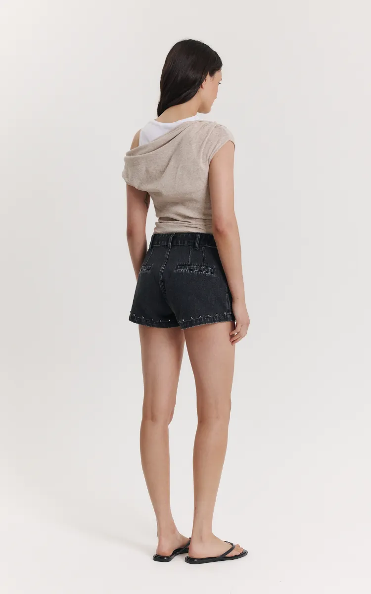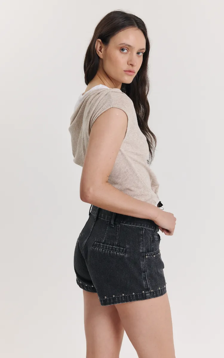 Short de denim negro, tiro medio y calce relajado. Micro tachas metálicas en bolsillos y ruedo, cierre frontal con botón, bolsillos laterales y traseros tipo ojal, incluye cinto con ojales.