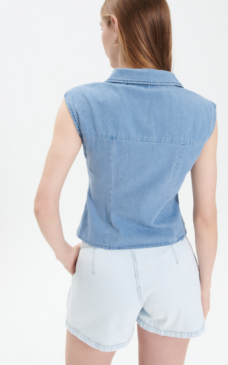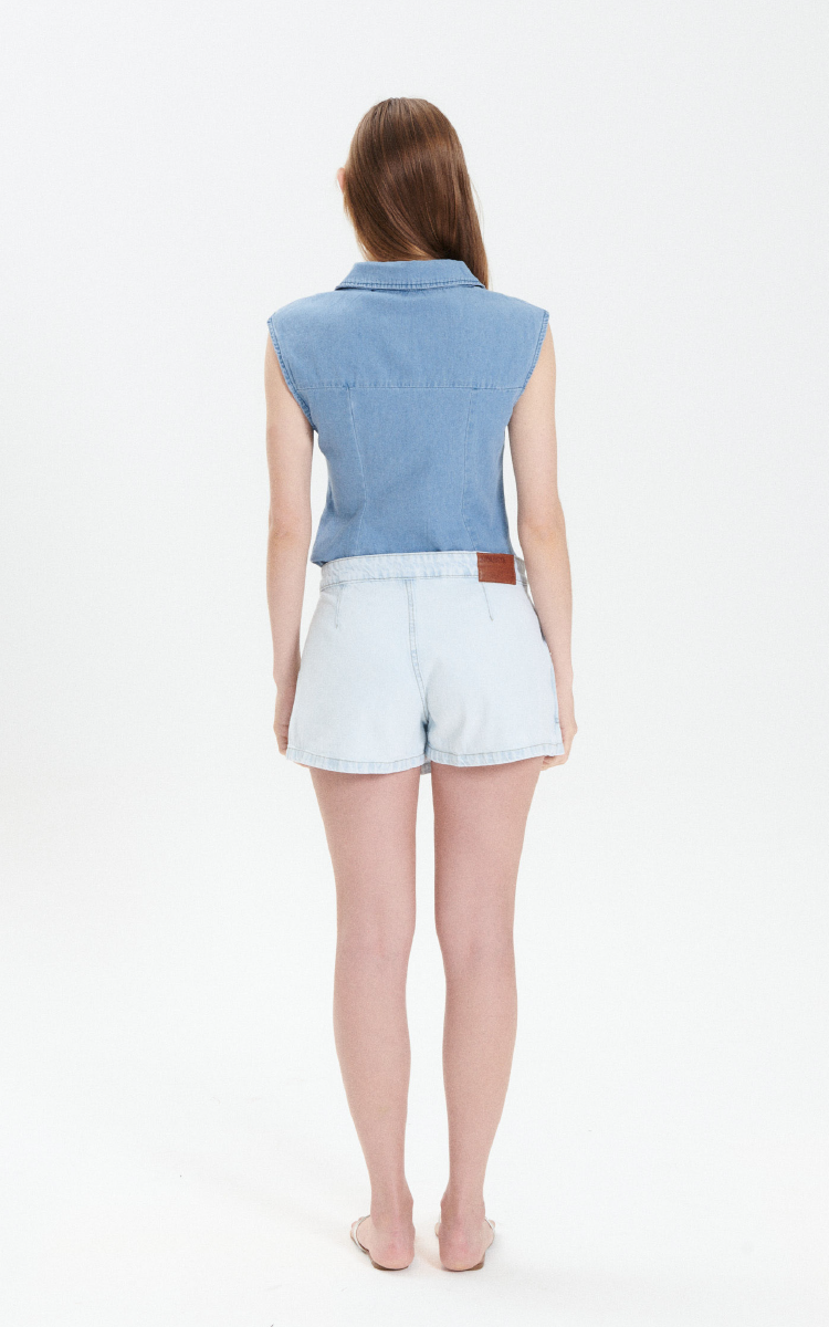 Skort denim rígido. Tiro alto. Falda cruzada con botón y 2 bolsillos laterales profundos.