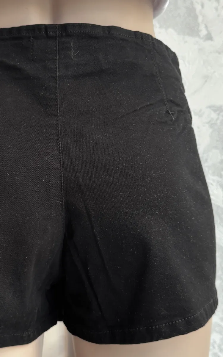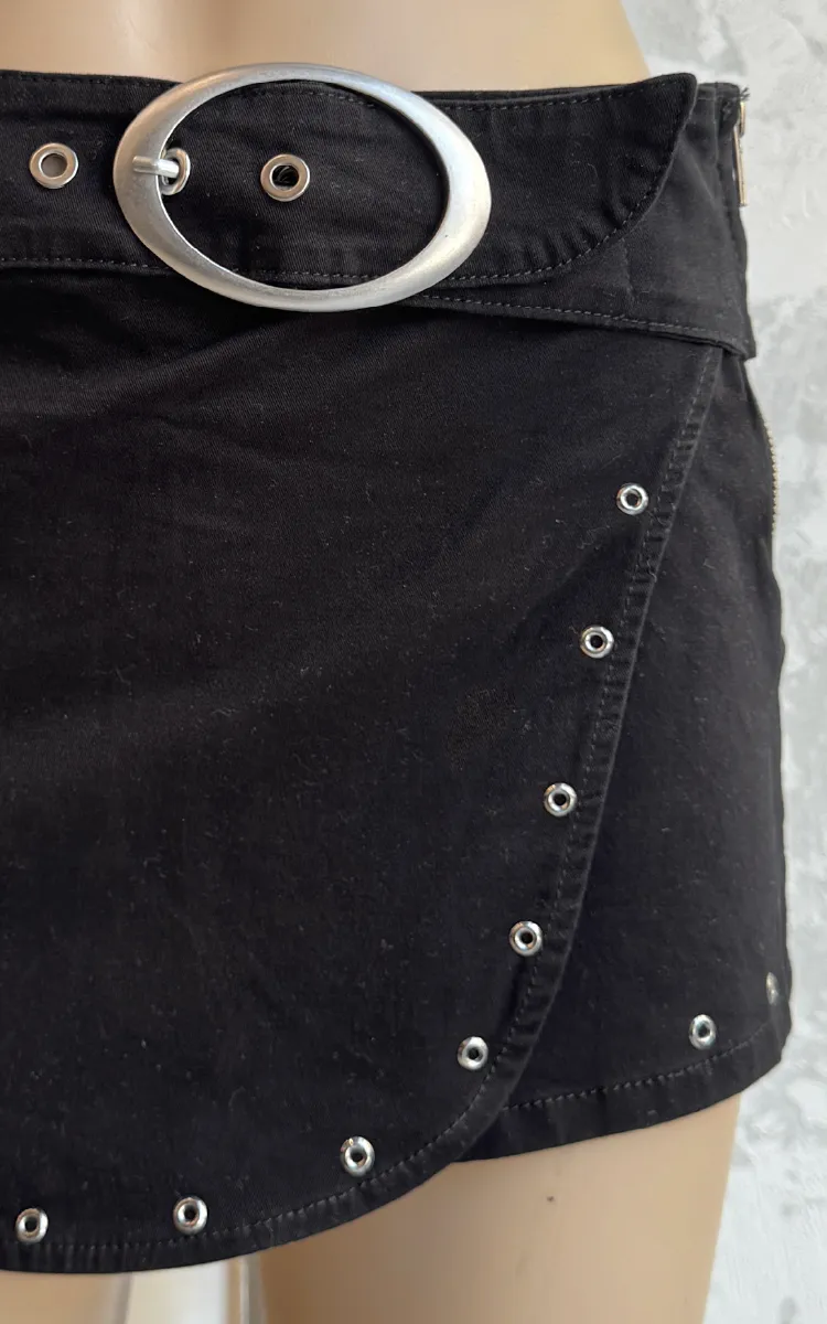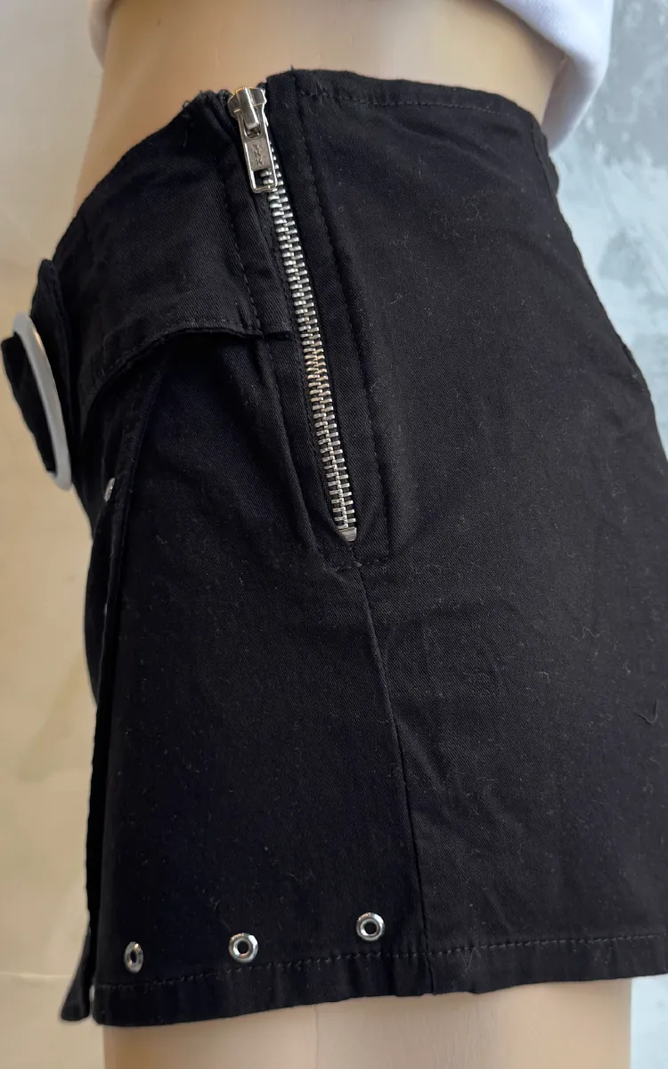 Skort en gabardina comfort negra. Diseño de inspiración retro con detalle de hebilla en la cintura y argollas metálicas en el delantero.