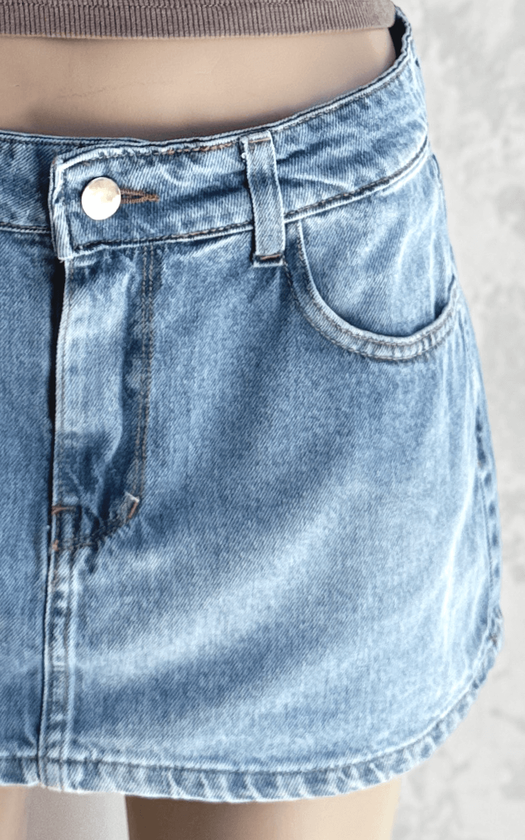 Skort tiro bajo en denim rígido. Con short interno de microfibra para mayor comodidad y diseño de 5 bolsillos funcionales.