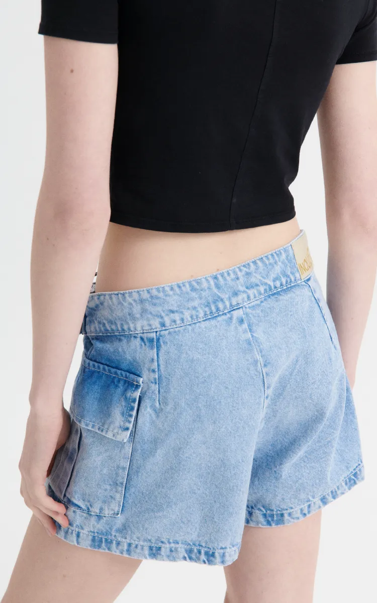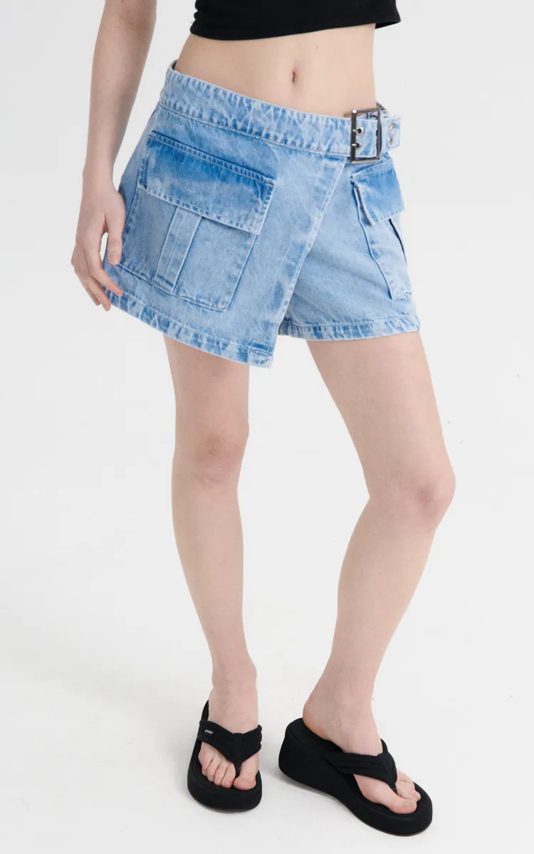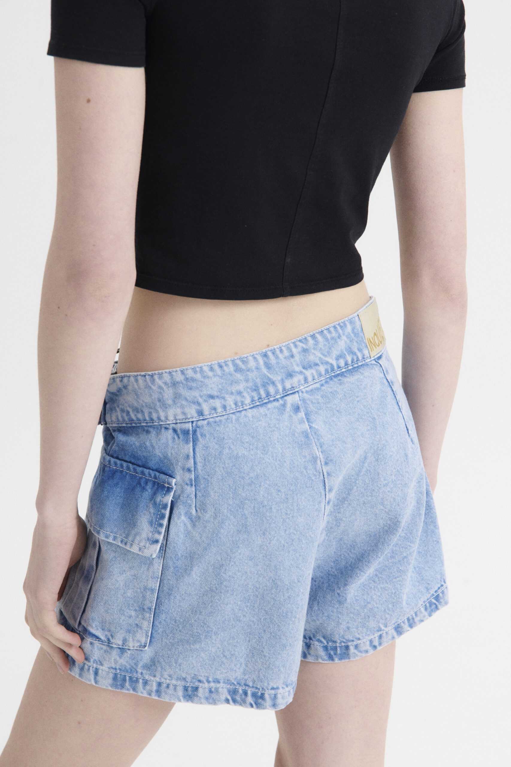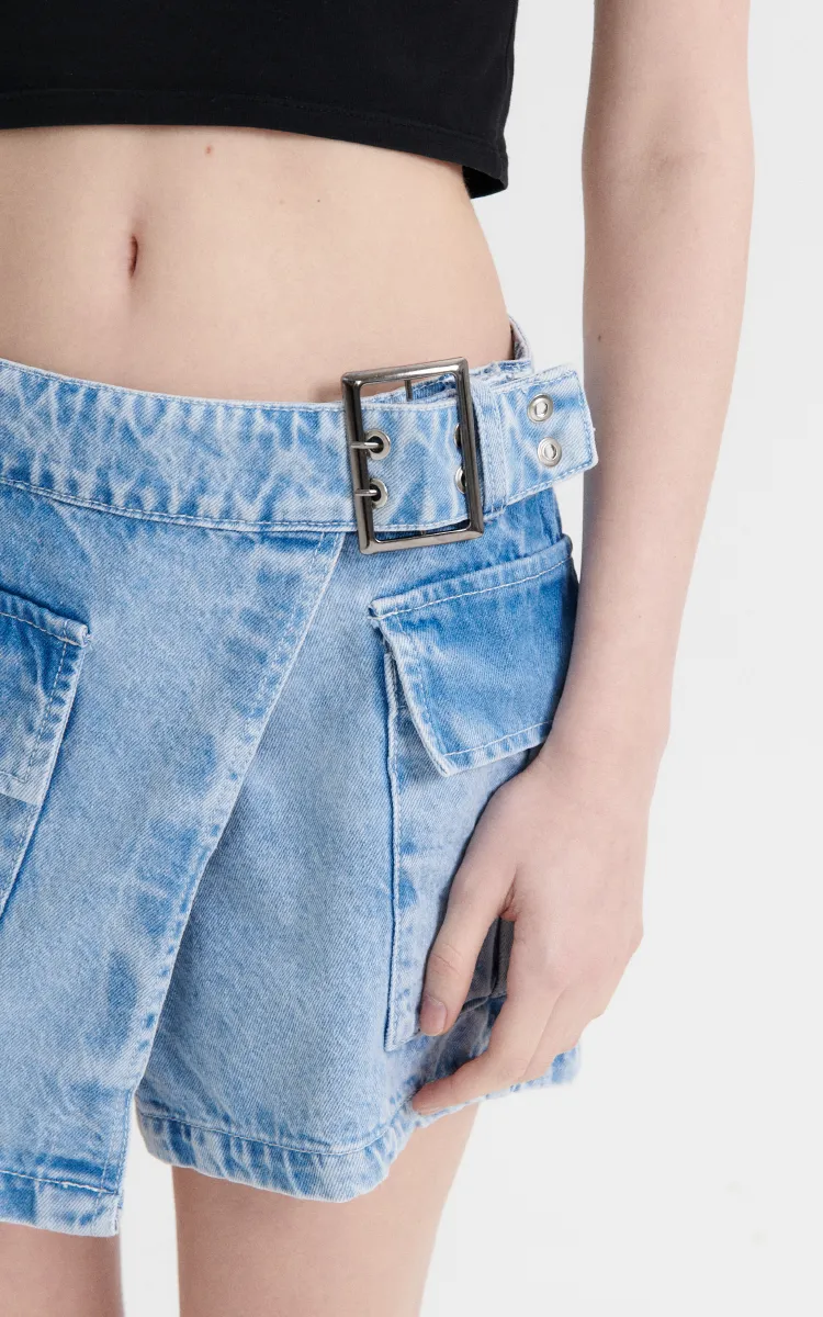 Skort cargo denim rígido. Tiro medio. Detalle de falda cruzada con hebilla para regular. 2 bolsillos con tapa.