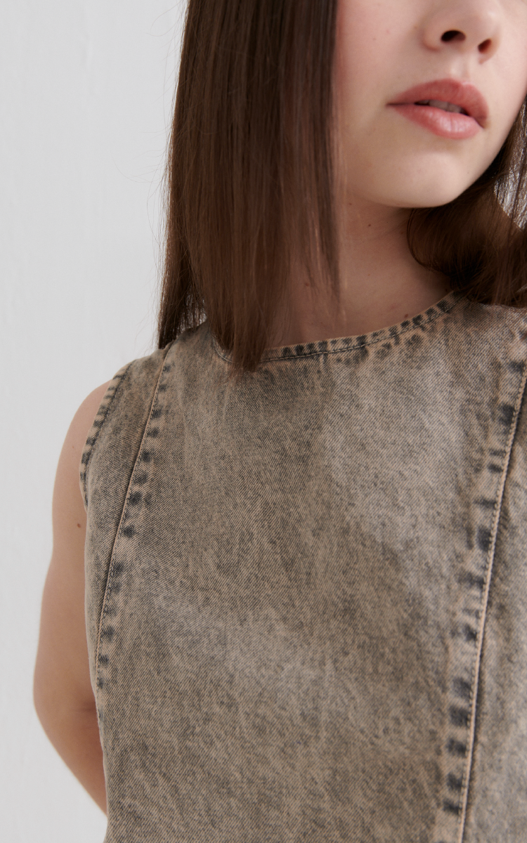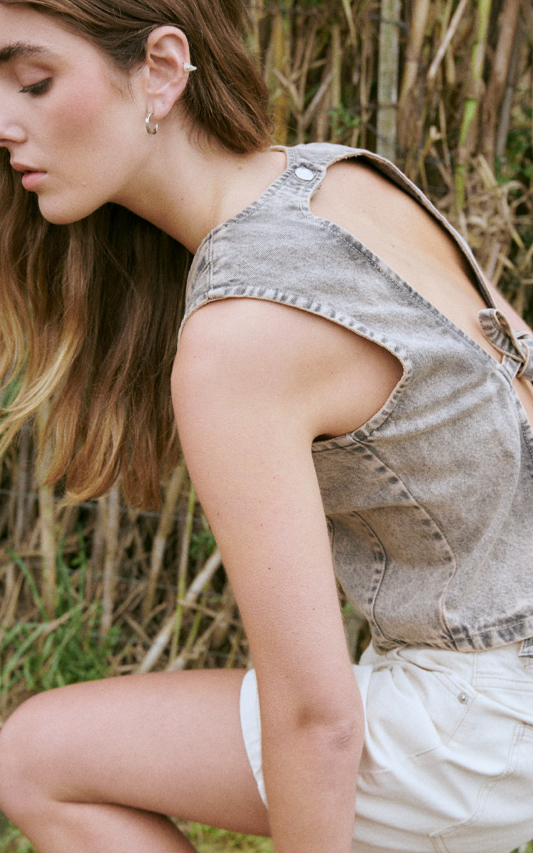 Top denim rígido matizado. Espalda descubierta con broche y lazo.