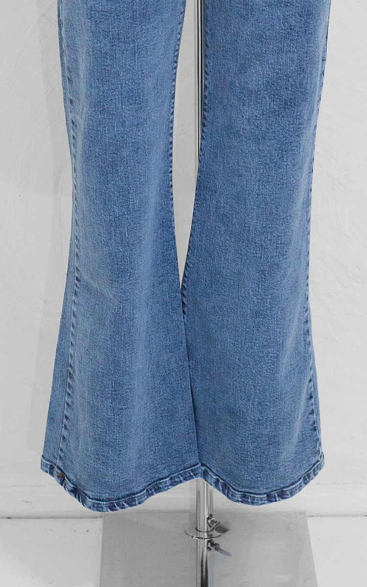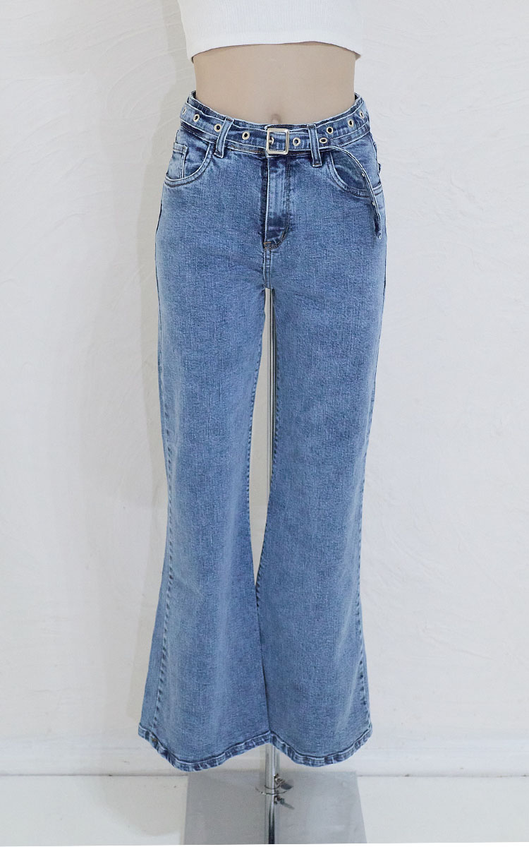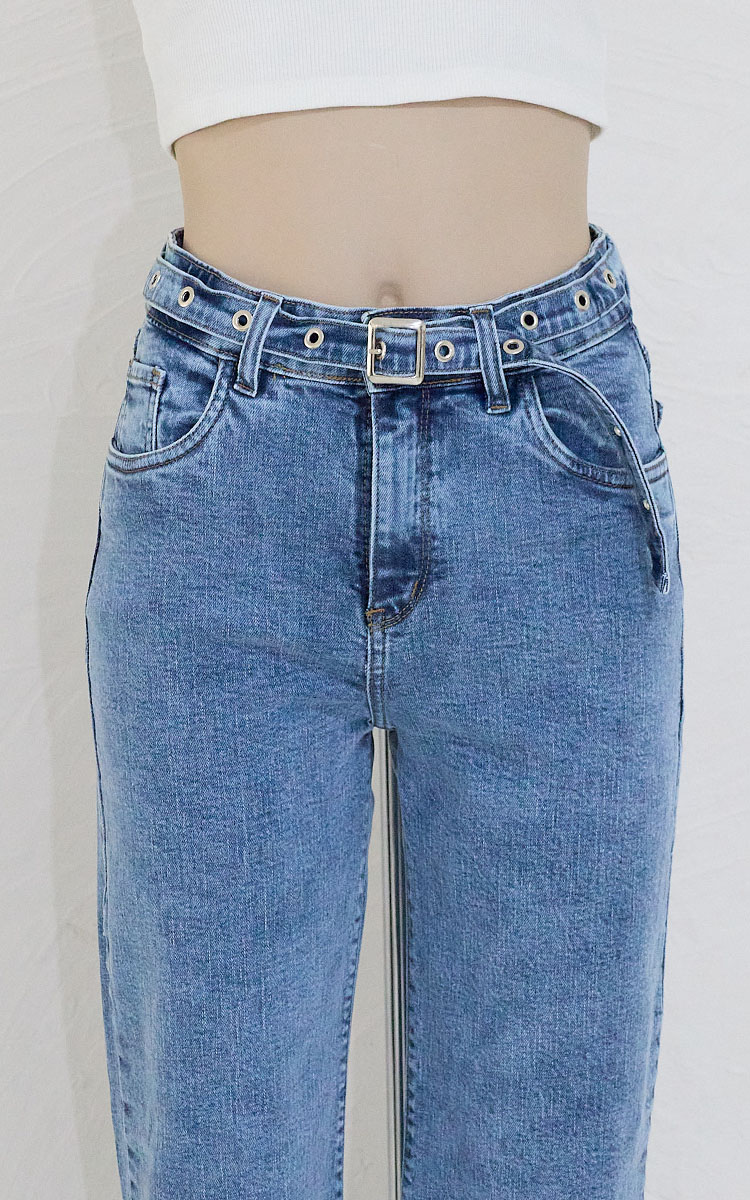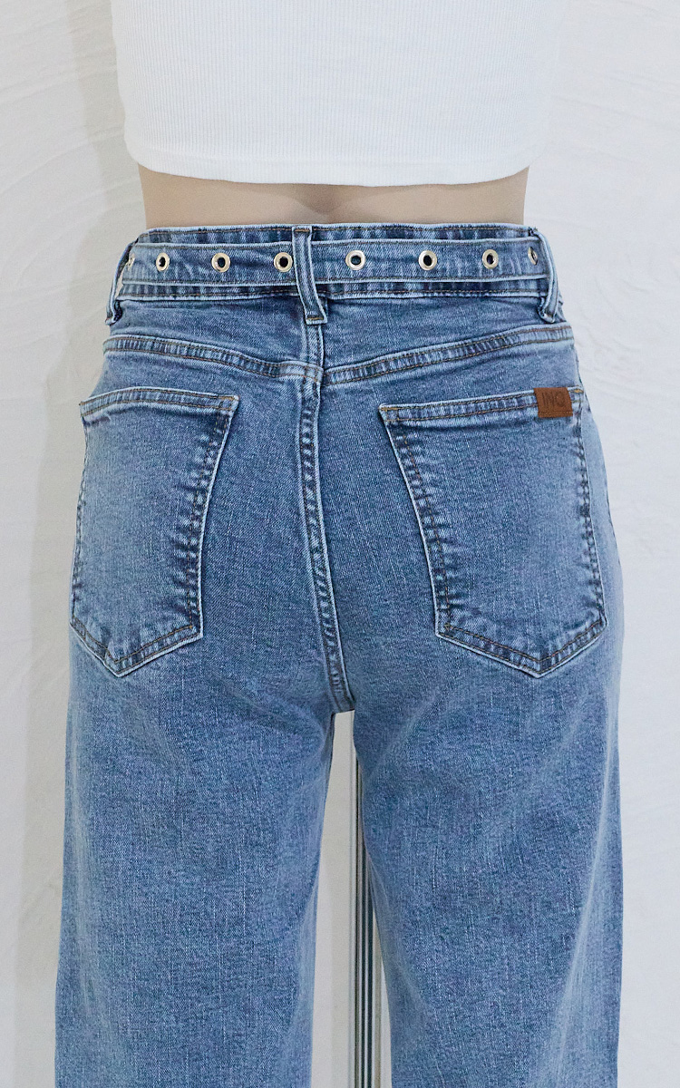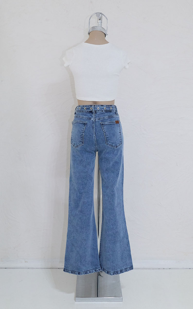 Jean wide de tiro alto confeccionado en denim elastizado de calidad premium que aporta comodidad. Diseño clásico de 5 bolsillos con lavado azul claro. Incluye cinto del mismo denim y mismo lavado, con hebilla metálica y argollas decorativas alrededor de la cintura que aportan un detalle distintivo al modelo.