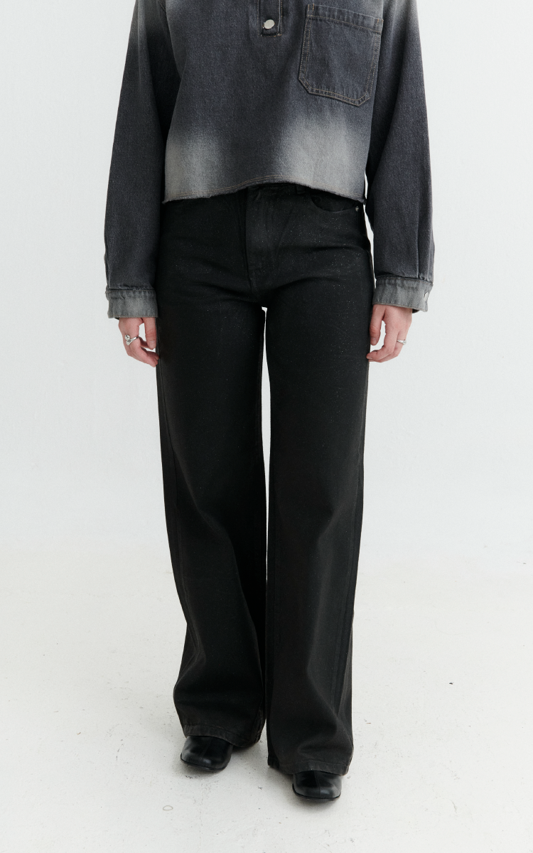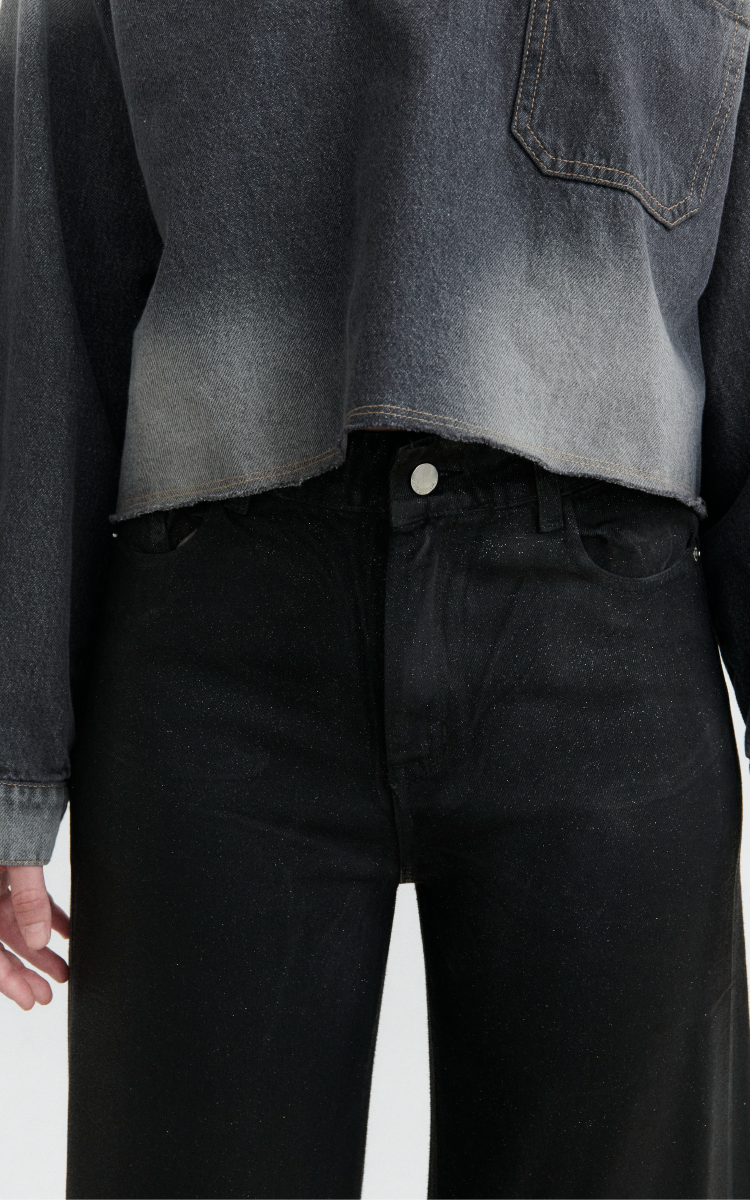 Jean wide leg de tiro alto en denim 100% algodón con efecto glitter engomado. Diseño de 5 bolsillos.